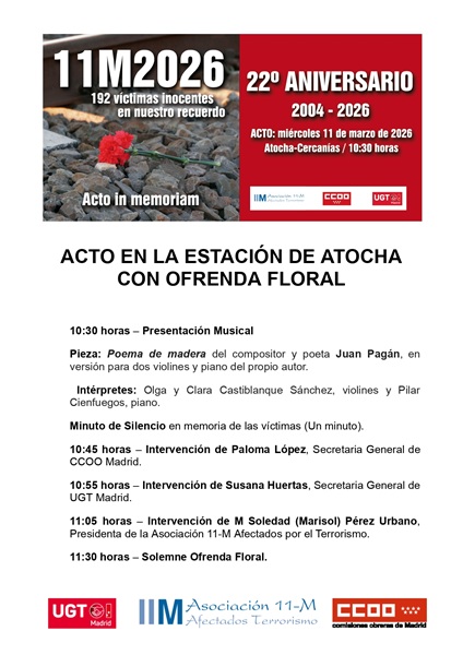 - 10:30h. Acto conjunto con CCOO, UGT, en Atocha, al lado de la cúpula exterior, como siempre, junto a la escultura El día y la noche.