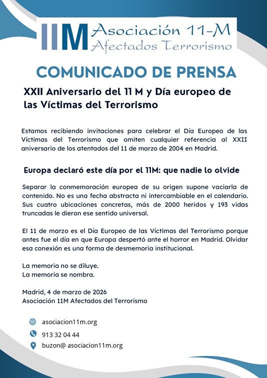 Comunicado de Prensa: XXII Aniversario del 11M y, por ello, Día Europeo de las Víctimas del Terrorismo
