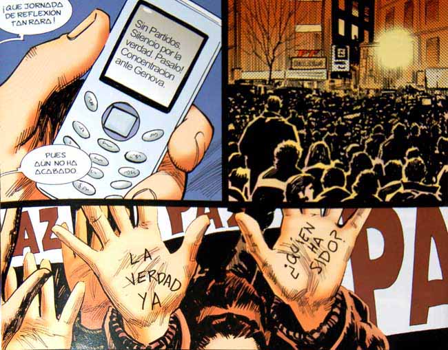 Otro aspecto que hace muy interesante la lectura de 11-M. La novela gráfica es la reconstrucción de los convulsos días posteriores al atentado. El impacto que provocó en los sentimientos y las conciencias, el desastroso manejo de la situación por parte del Gobierno o los actos de repulsa y sus implicaciones políticas tienen un lugar central en el relato.