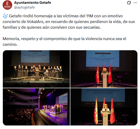 También agradecemos el minuto de silencio convocado por la Federación Española de Municipios y Provincias (FEMP), este miércoles 11 de marzo a las 12.00 horas para conmemorar el Día Europeo de las Víctimas del Terrorismo y en memoria de las víctimas del atentado yihadista en la red ferroviaria de Madrid en 2004.